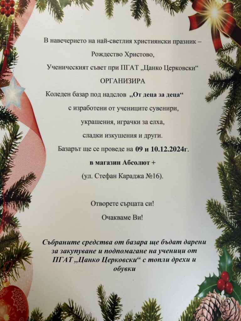 Ученическият съвет кани всички жители и гости на града да посетят базара, да се насладят на празничната атмосфера и да станат част от тази благородна инициатива. Всеки, който се включи, ще има възможност не само да подготви красиви подаръци за своите близки, но и да помогне за това Коледата да бъде по-топла и по-светла за учениците в нужда.