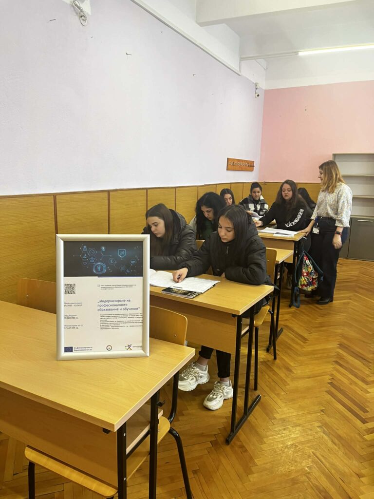 В ПГАТ „Цанко Церковски“ гр. Павликени продължава провеждането на допълнително обучение по „Чужд език по професията“ – английски език в рамките на Дейност 7 по проект BG05SFPR001-3.001-0001 „Модернизиране на професионалното образование и обучение“, финансиран по Програма „Образование“ 2021–2027, съфинансиран от Европейския съюз.