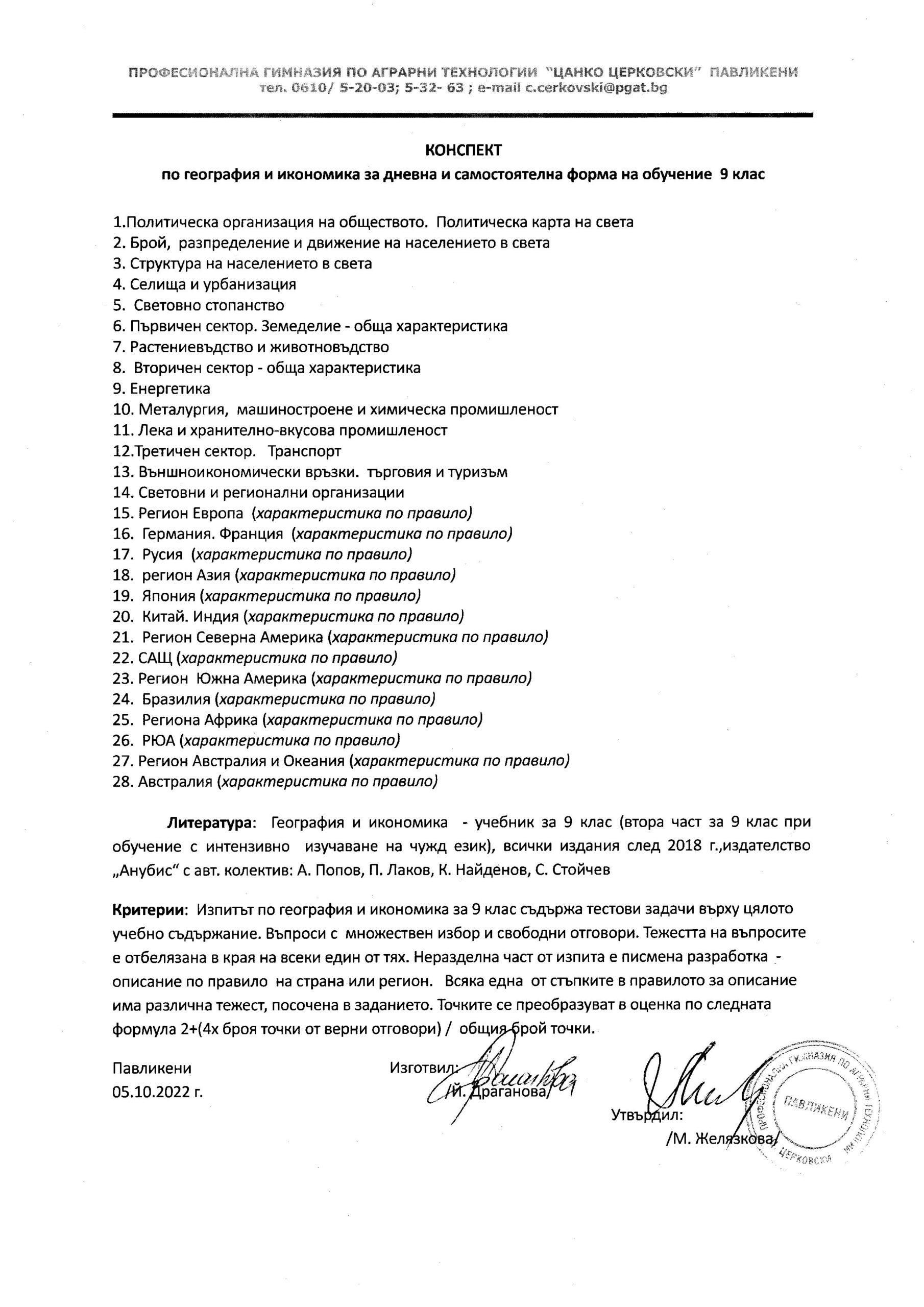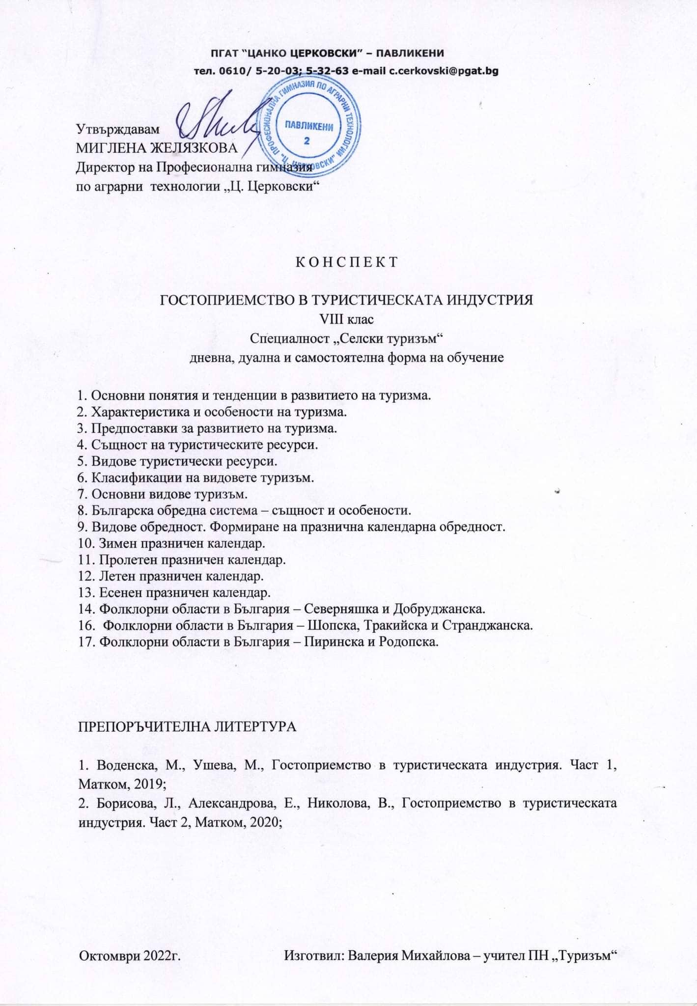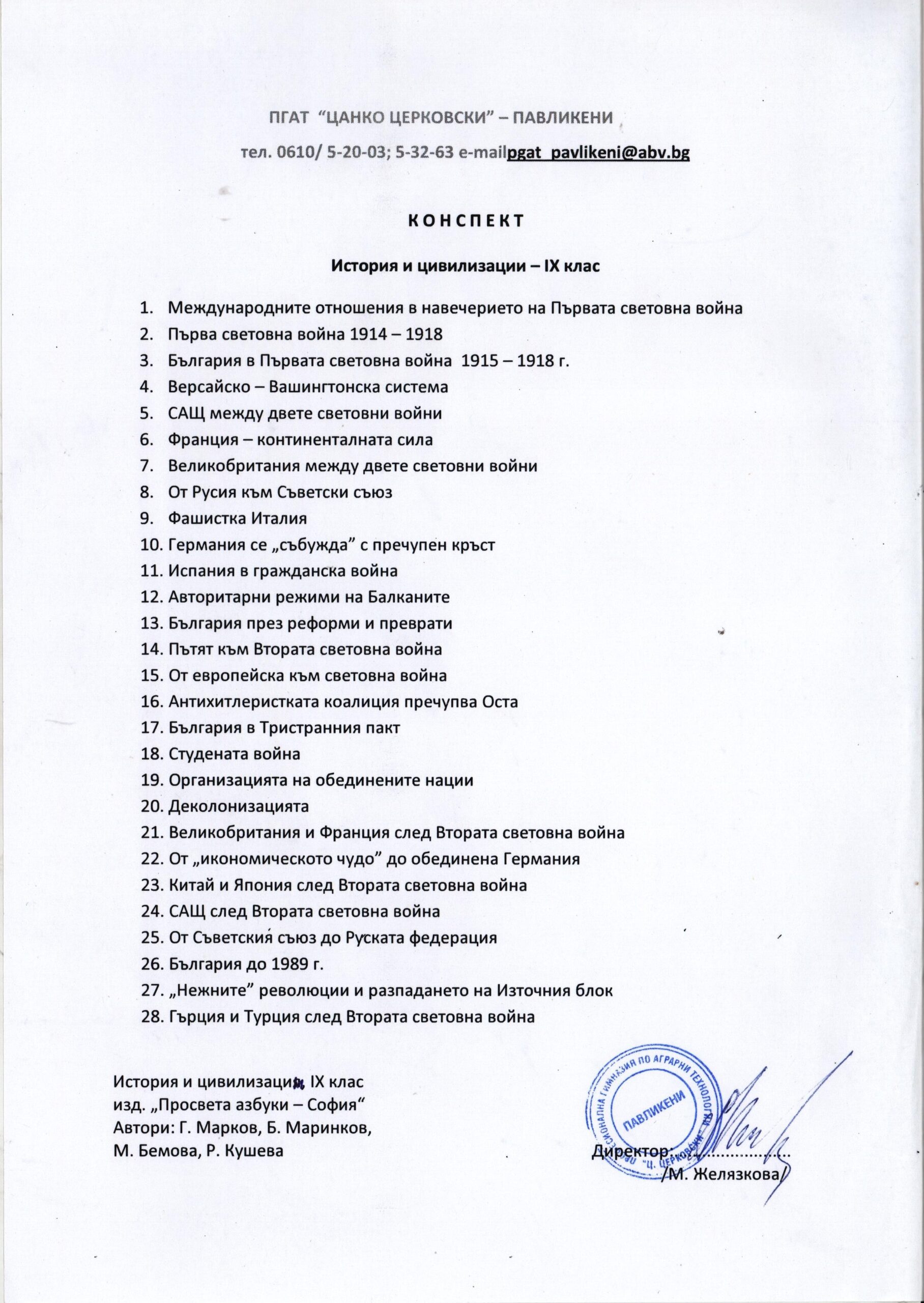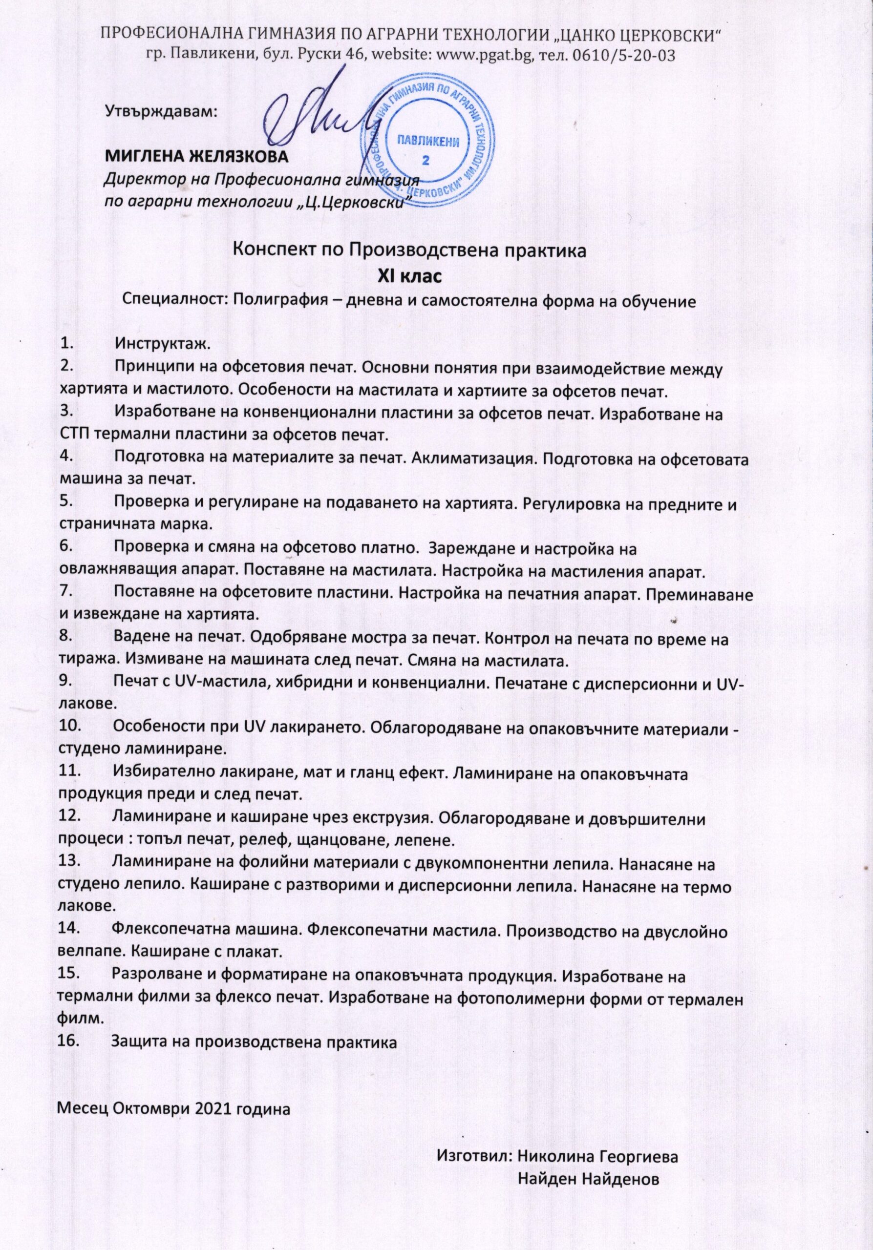 ОБЩООБРАЗОВАТЕЛНА ПОДГОТОВКА 8 класБЕЛ 8 класМатематика 8 класАнглийски език 8 класРуски език 8 класГеография и икономика 8 класФизика и астрономия 8 класХимия и опазване на околната среда 8 класИстория и цивилизация 8 класБиология и здравно образование 8 класИнформационни технологии 8 класФилософия 8 класПредприемачество 8 класМузика 8 класИзобразително изкуство 8 класФизическо възпитание и спорт 8 клас–––––––––––––––––9 класБЕЛ 9 класМатематика 9 класАнглийски език 9 класГеография и икономика 9 класФизика и астрономия 9 класХимия и опазване на околната среда 9 класИстория и цивилизация 9 класБиология и здравно образование 9 класИнформационни технологии 9 клас Философия 9 класМузика 9 класИзобразително изкуство 9 класФизическо възпитание и спорт 9 клас ––––––––––––––––– 10 класБЕЛ 10 класАнглийски език 10 класМатематика 10 класГеография и икономика 10 класФизика и астрономия 10 класХимия и опазване на околната среда 10 класИстория и цивилизация 10 класБиология и здравно образование 10 класИнформационни технологии 10 клас Философия 10 класМузика 10 класИзобразително изкуство 10 клас ––––––––––––––––– 11 класБЕЛ 11 класРуски език 11 класГражданско образование 11 клас ––––––––––––––––– 12 класБЕЛ 12 класМатематика 12 класСвят и личност 12 класГражданско образование 12 клас ПРОФЕСИОНАЛНА ПОДГОТОВКА Обща професионалнаподготовкаЗдравословни и безопасни условия на трудИкономика за всички неикономически специалности ––––––––––––––––– Механизация на селското стопанствоОснови на земеделието 8 класАгроекология и растителна защита 8 класБиологично земеделие 9 класТехническо чертане 9 класТрактори и автомобили 9 класСелскостопанска техника РПП 9 класСелскостопанска техника РПП – практика 9 класСелскостопанска техника РПП – практика 9 класЗемеделска техника – теория 10 класЗемеделска техника – практика 10 класТрактори и автомобили – теория 10 класТрактори и автомобили – практика 10 класСелскостопанска техника РПП – теория 10 класСелскостопанска техника РПП – практика 10 класЗемеделска техника – теория 11 класЗемеделска техника – практика 11 класТрактори и автомобили – теория 11 класТрактори и автомобили – практика 11 класСелскостопанска техника РПП – теория 11 класРабота с машинно-тракторни агрегати 11 класДиагностика и ремонт – теория 12 класДиагностика и ремонт – практика 12 класАвтоматизирани системи в земеделието 12 класЕксплоатация на земеделска техника – теория 12 класЕксплоатация на земеделска техника – практика 12 класПрибираща земеделска техника – теория 12 класПрибираща земеделска техника – практика 12 класХидравлични и пневматични устройства 12 класСелскостопанска техника РПП 12 класРабота с машинно-тракторни агрегати 12 клас ––––––––––––––––– ПолиграфияОбща полиграфия – теория 8 класОбща полиграфия – практика 8 класМатериали и технологии за производство на опаковки – теория 8 класМатериали и технологии за производство на опаковки – практика 8 клас Обща полиграфия СпПП – теория 9 класОбща полиграфия СпПП – практика 9 клас Обща полиграфия РПП – теория 9 клас Обща полиграфия РПП – практика 9 класМатериали и технологии за производство на опаковки РПП – теория 9 класМатериали и технологии за производство на опаковки РПП – практика 9 класОбща полиграфия – теория 10 клас