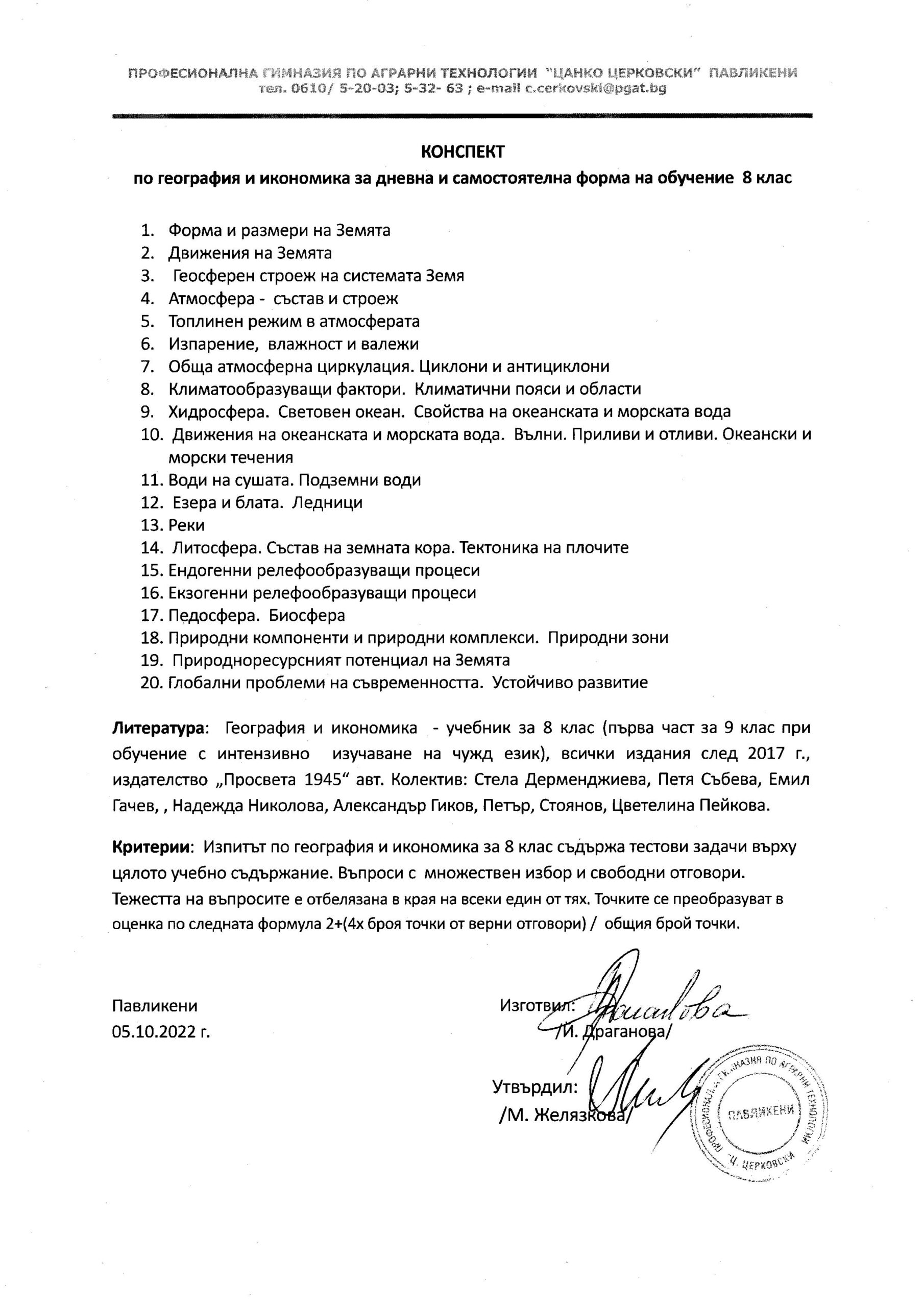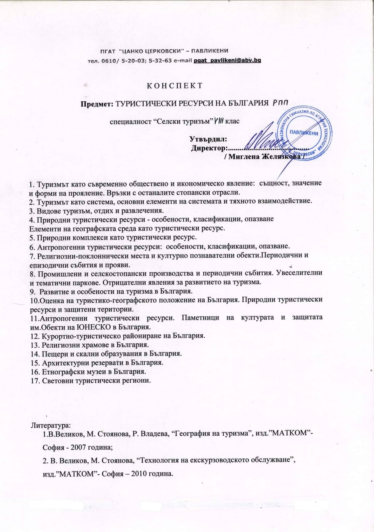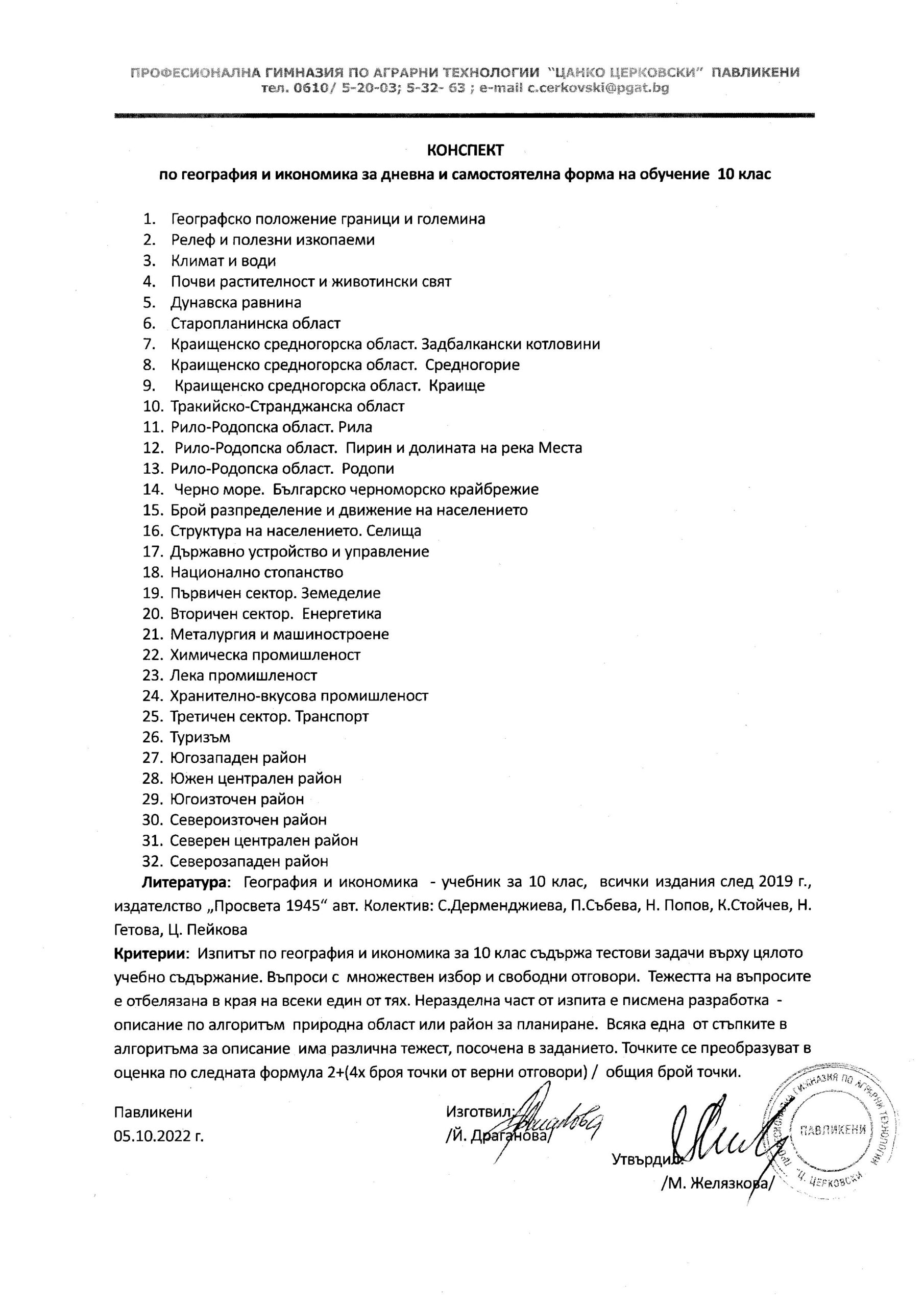 ОБЩООБРАЗОВАТЕЛНА ПОДГОТОВКА 8 класБЕЛ 8 класМатематика 8 класАнглийски език 8 класРуски език 8 класГеография и икономика 8 класФизика и астрономия 8 класХимия и опазване на околната среда 8 класИстория и цивилизация 8 класБиология и здравно образование 8 класИнформационни технологии 8 класФилософия 8 класПредприемачество 8 класМузика 8 класИзобразително изкуство 8 класФизическо възпитание и спорт 8 клас–––––––––––––––––9 класБЕЛ 9 класМатематика 9 класАнглийски език 9 класГеография и икономика 9 класФизика и астрономия 9 класХимия и опазване на околната среда 9 класИстория и цивилизация 9 класБиология и здравно образование 9 класИнформационни технологии 9 клас Философия 9 класМузика 9 класИзобразително изкуство 9 класФизическо възпитание и спорт 9 клас ––––––––––––––––– 10 класБЕЛ 10 класАнглийски език 10 класМатематика 10 класГеография и икономика 10 класФизика и астрономия 10 класХимия и опазване на околната среда 10 класИстория и цивилизация 10 класБиология и здравно образование 10 класИнформационни технологии 10 клас Философия 10 класМузика 10 класИзобразително изкуство 10 клас ––––––––––––––––– 11 класБЕЛ 11 класРуски език 11 класГражданско образование 11 клас ––––––––––––––––– 12 класБЕЛ 12 класМатематика 12 класСвят и личност 12 класГражданско образование 12 клас ПРОФЕСИОНАЛНА ПОДГОТОВКА Обща професионалнаподготовкаЗдравословни и безопасни условия на трудИкономика за всички неикономически специалности ––––––––––––––––– Механизация на селското стопанствоОснови на земеделието 8 класАгроекология и растителна защита 8 класБиологично земеделие 9 класТехническо чертане 9 класТрактори и автомобили 9 класСелскостопанска техника РПП 9 класСелскостопанска техника РПП – практика 9 класСелскостопанска техника РПП – практика 9 класЗемеделска техника – теория 10 класЗемеделска техника – практика 10 класТрактори и автомобили – теория 10 класТрактори и автомобили – практика 10 класСелскостопанска техника РПП – теория 10 класСелскостопанска техника РПП – практика 10 класЗемеделска техника – теория 11 класЗемеделска техника – практика 11 класТрактори и автомобили – теория 11 класТрактори и автомобили – практика 11 класСелскостопанска техника РПП – теория 11 класРабота с машинно-тракторни агрегати 11 класДиагностика и ремонт – теория 12 класДиагностика и ремонт – практика 12 класАвтоматизирани системи в земеделието 12 класЕксплоатация на земеделска техника – теория 12 класЕксплоатация на земеделска техника – практика 12 класПрибираща земеделска техника – теория 12 класПрибираща земеделска техника – практика 12 класХидравлични и пневматични устройства 12 класСелскостопанска техника РПП 12 класРабота с машинно-тракторни агрегати 12 клас ––––––––––––––––– ПолиграфияОбща полиграфия – теория 8 класОбща полиграфия – практика 8 класМатериали и технологии за производство на опаковки – теория 8 класМатериали и технологии за производство на опаковки – практика 8 клас Обща полиграфия СпПП – теория 9 класОбща полиграфия СпПП – практика 9 клас Обща полиграфия РПП – теория 9 клас Обща полиграфия РПП – практика 9 класМатериали и технологии за производство на опаковки РПП – теория 9 класМатериали и технологии за производство на опаковки РПП – практика 9 класОбща полиграфия – теория 10 клас