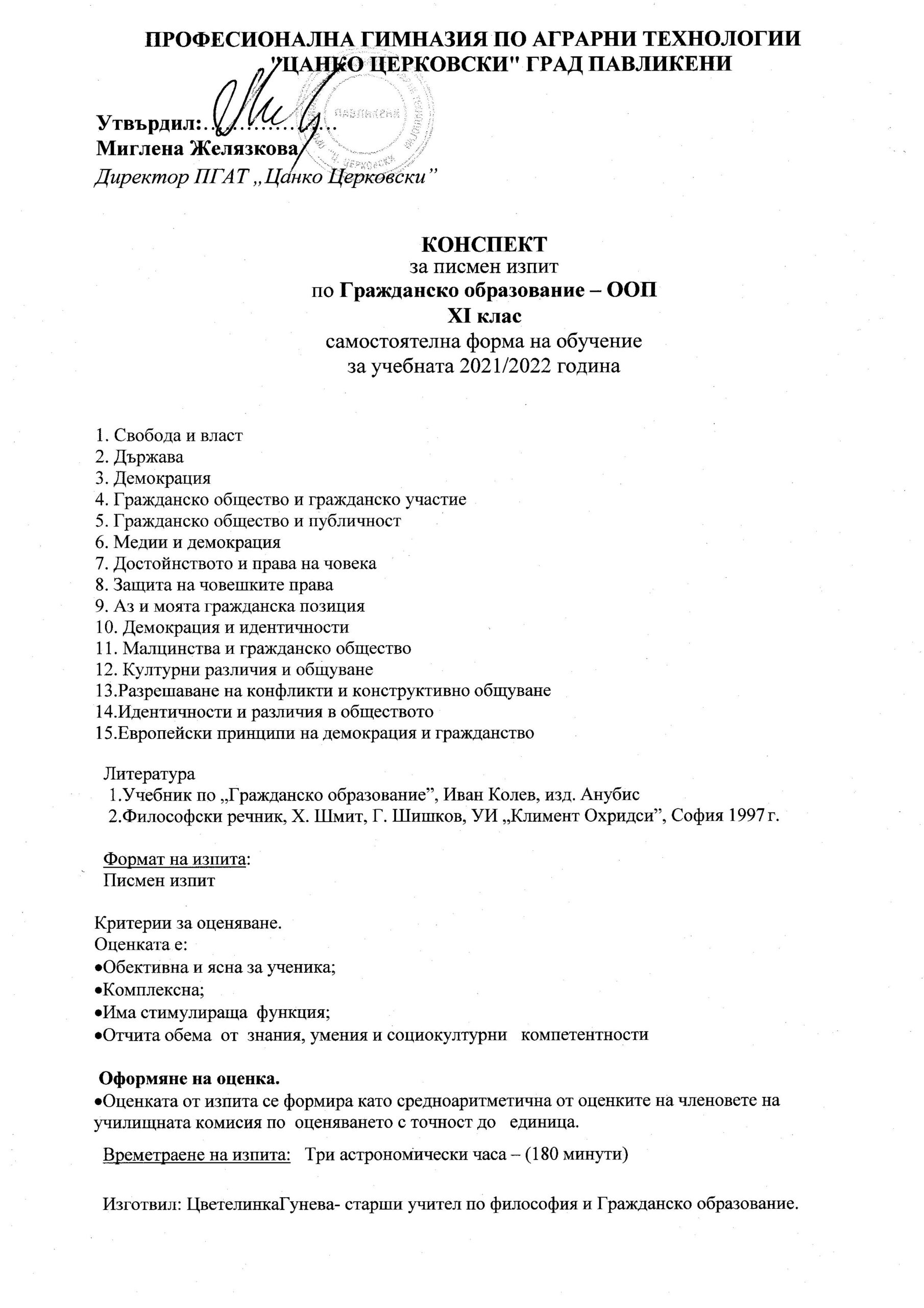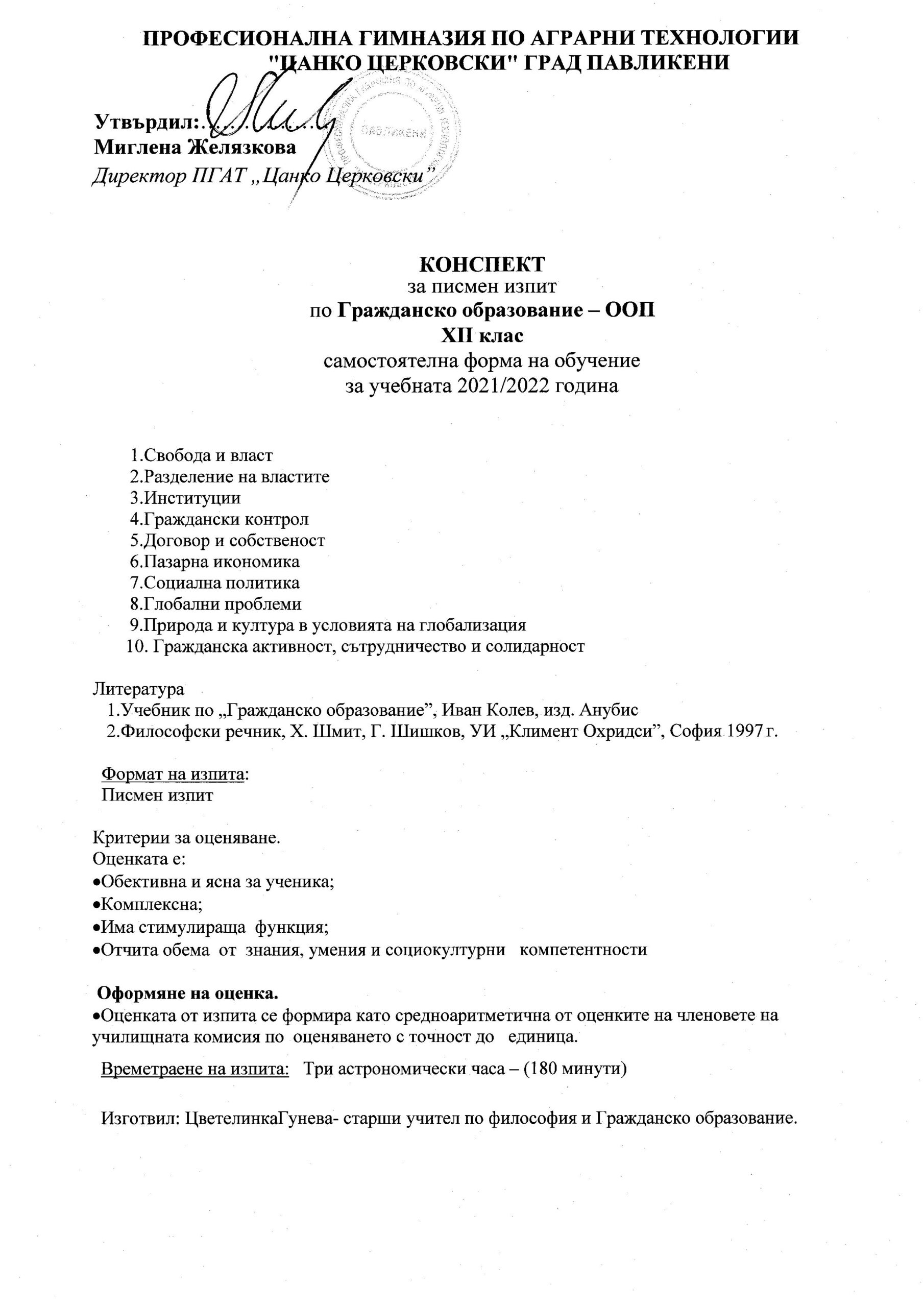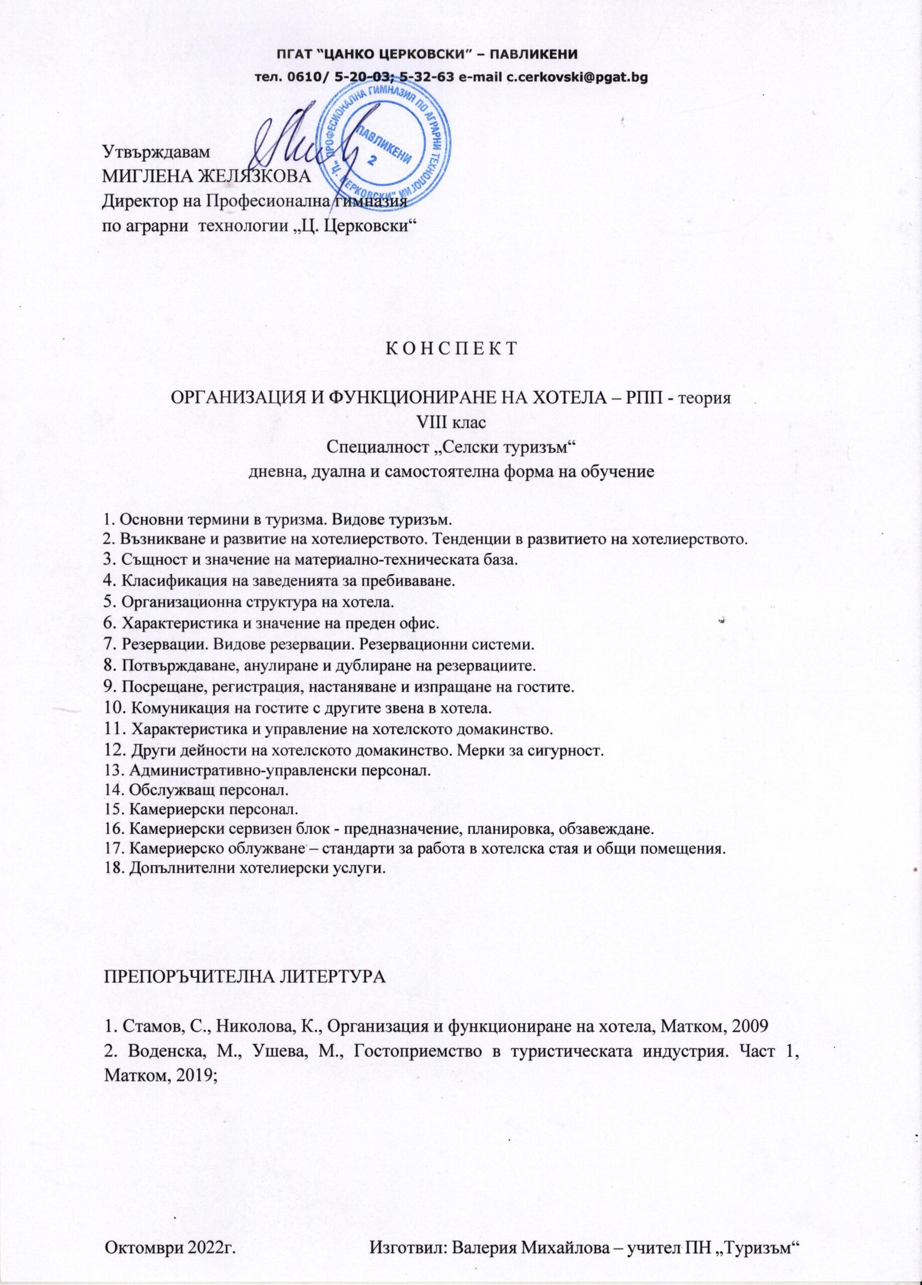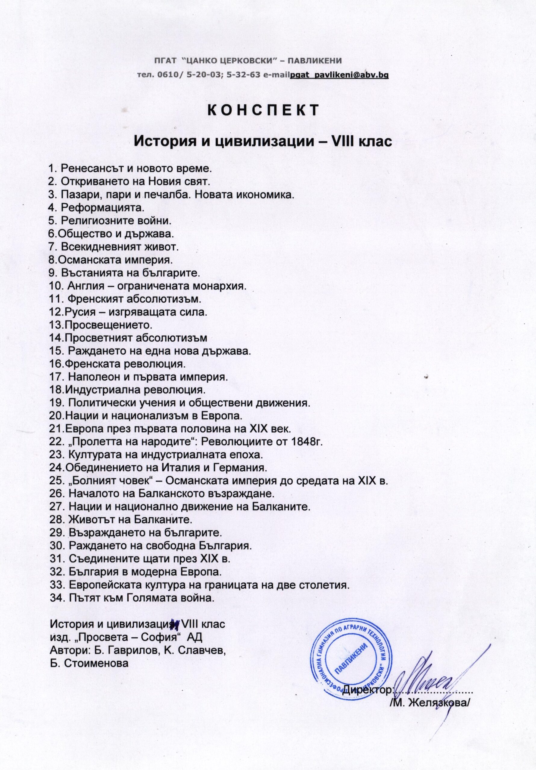 ОБЩООБРАЗОВАТЕЛНА ПОДГОТОВКА 8 класБЕЛ 8 класМатематика 8 класАнглийски език 8 класРуски език 8 класГеография и икономика 8 класФизика и астрономия 8 класХимия и опазване на околната среда 8 класИстория и цивилизация 8 класБиология и здравно образование 8 класИнформационни технологии 8 класФилософия 8 класПредприемачество 8 класМузика 8 класИзобразително изкуство 8 класФизическо възпитание и спорт 8 клас–––––––––––––––––9 класБЕЛ 9 класМатематика 9 класАнглийски език 9 класГеография и икономика 9 класФизика и астрономия 9 класХимия и опазване на околната среда 9 класИстория и цивилизация 9 класБиология и здравно образование 9 класИнформационни технологии 9 клас Философия 9 класМузика 9 класИзобразително изкуство 9 класФизическо възпитание и спорт 9 клас ––––––––––––––––– 10 класБЕЛ 10 класАнглийски език 10 класМатематика 10 класГеография и икономика 10 класФизика и астрономия 10 класХимия и опазване на околната среда 10 класИстория и цивилизация 10 класБиология и здравно образование 10 класИнформационни технологии 10 клас Философия 10 класМузика 10 класИзобразително изкуство 10 клас ––––––––––––––––– 11 класБЕЛ 11 класРуски език 11 класГражданско образование 11 клас ––––––––––––––––– 12 класБЕЛ 12 класМатематика 12 класСвят и личност 12 класГражданско образование 12 клас ПРОФЕСИОНАЛНА ПОДГОТОВКА Обща професионалнаподготовкаЗдравословни и безопасни условия на трудИкономика за всички неикономически специалности ––––––––––––––––– Механизация на селското стопанствоОснови на земеделието 8 класАгроекология и растителна защита 8 класБиологично земеделие 9 класТехническо чертане 9 класТрактори и автомобили 9 класСелскостопанска техника РПП 9 класСелскостопанска техника РПП – практика 9 класСелскостопанска техника РПП – практика 9 класЗемеделска техника – теория 10 класЗемеделска техника – практика 10 класТрактори и автомобили – теория 10 класТрактори и автомобили – практика 10 класСелскостопанска техника РПП – теория 10 класСелскостопанска техника РПП – практика 10 класЗемеделска техника – теория 11 класЗемеделска техника – практика 11 класТрактори и автомобили – теория 11 класТрактори и автомобили – практика 11 класСелскостопанска техника РПП – теория 11 класРабота с машинно-тракторни агрегати 11 класДиагностика и ремонт – теория 12 класДиагностика и ремонт – практика 12 класАвтоматизирани системи в земеделието 12 класЕксплоатация на земеделска техника – теория 12 класЕксплоатация на земеделска техника – практика 12 класПрибираща земеделска техника – теория 12 класПрибираща земеделска техника – практика 12 класХидравлични и пневматични устройства 12 класСелскостопанска техника РПП 12 класРабота с машинно-тракторни агрегати 12 клас ––––––––––––––––– ПолиграфияОбща полиграфия – теория 8 класОбща полиграфия – практика 8 класМатериали и технологии за производство на опаковки – теория 8 класМатериали и технологии за производство на опаковки – практика 8 клас Обща полиграфия СпПП – теория 9 класОбща полиграфия СпПП – практика 9 клас Обща полиграфия РПП – теория 9 клас Обща полиграфия РПП – практика 9 класМатериали и технологии за производство на опаковки РПП – теория 9 класМатериали и технологии за производство на опаковки РПП – практика 9 класОбща полиграфия – теория 10 клас