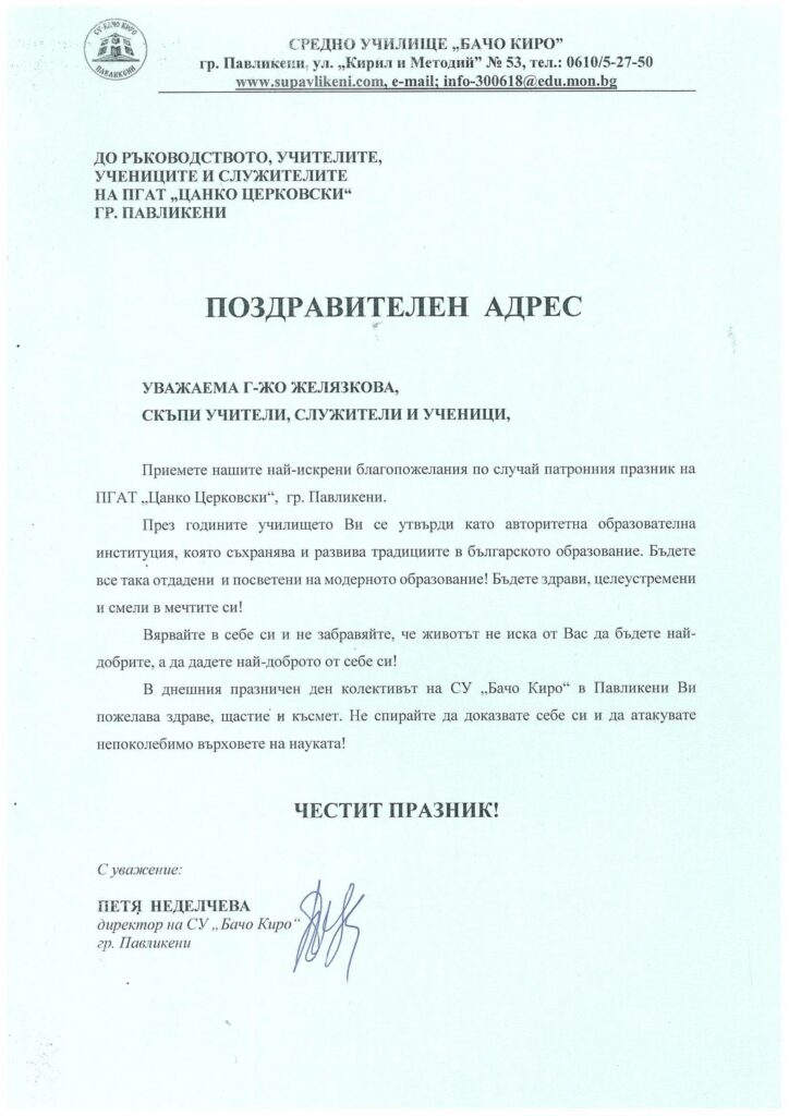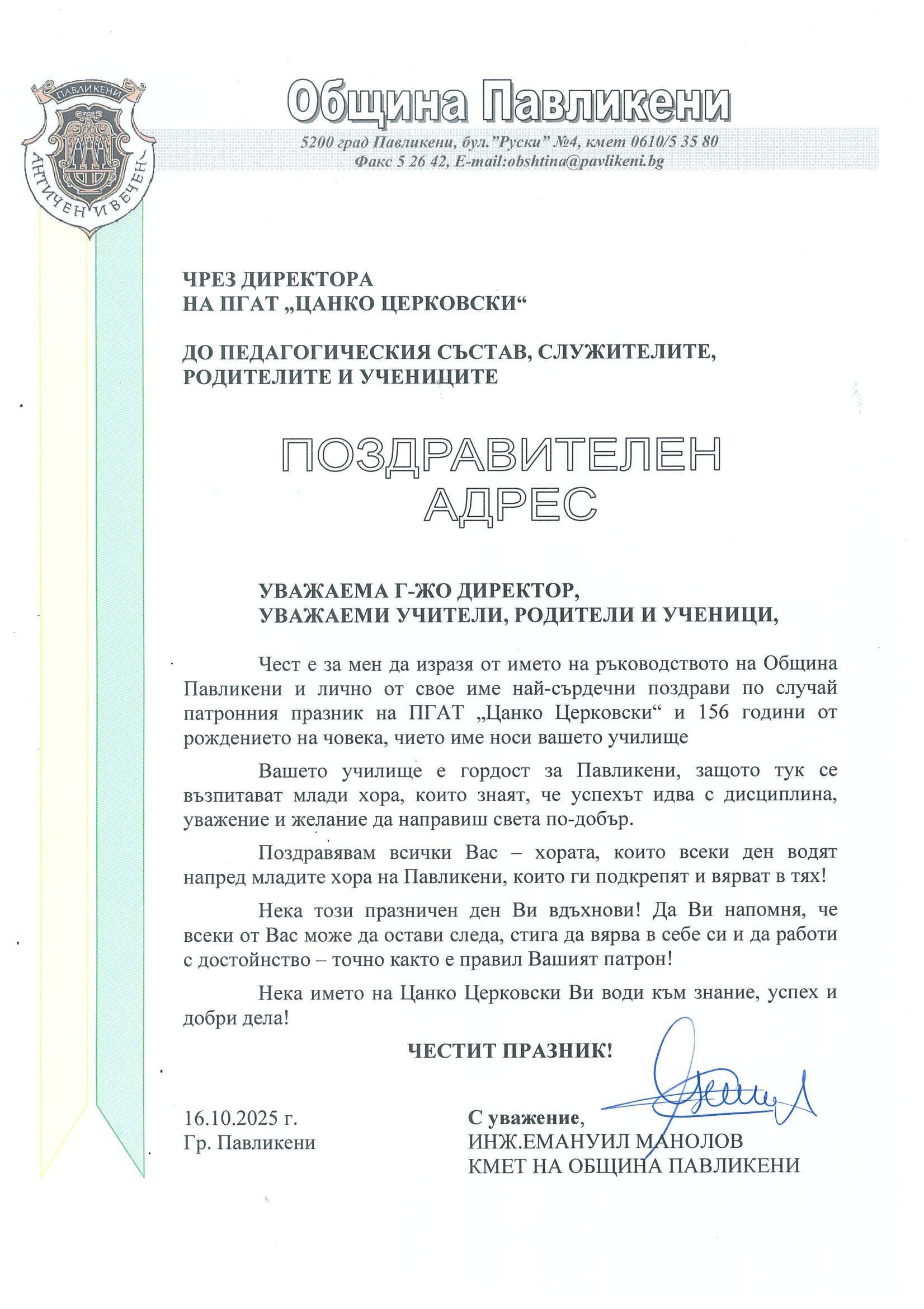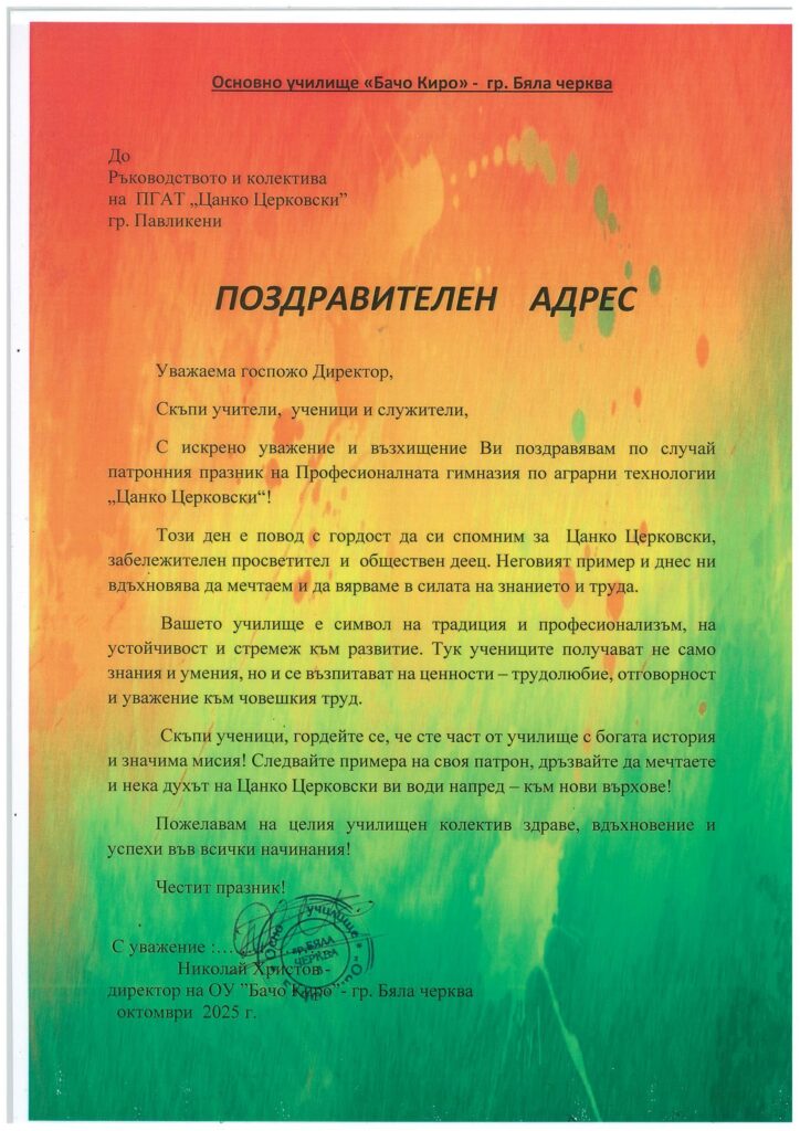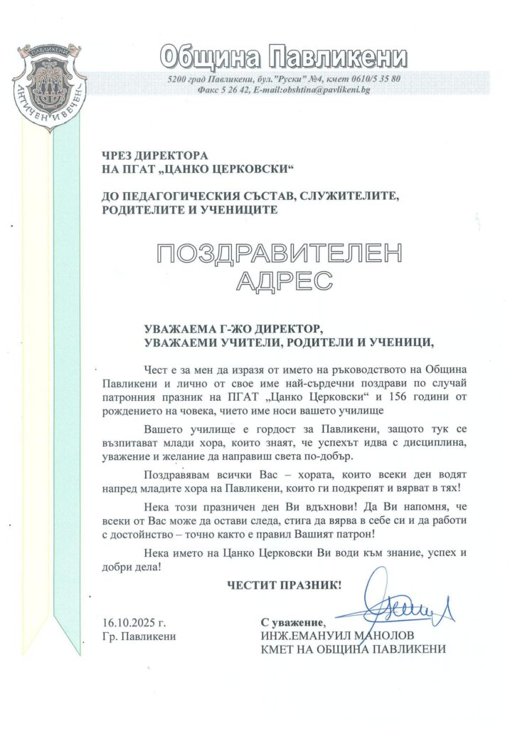 Кметът на общината инж. Емануил Манолов се обърна към учениците с думите, че всеки урок, всяко усилие, което влагат днес е стъпка по пътя на Цанко Церковски, човек вярвал в силата на образованието и труда. По-думите му общината инвестира постоянно в професионалната гимназия, защото в нея учат млади хора, които знаят, че успехът идва с дисциплина, уважение и желание да направят света по-добър.