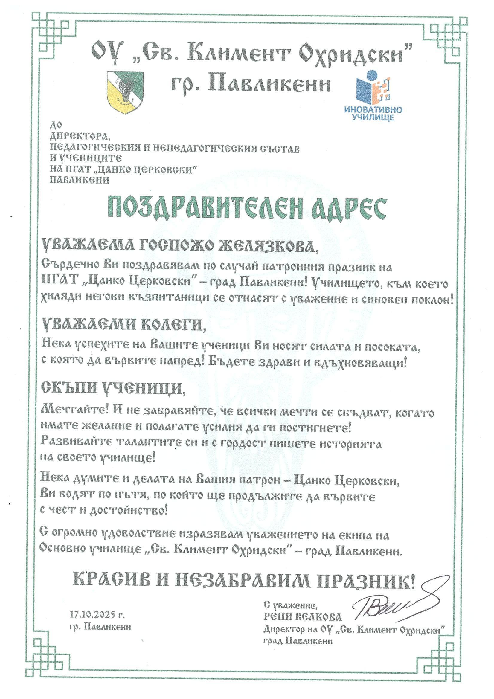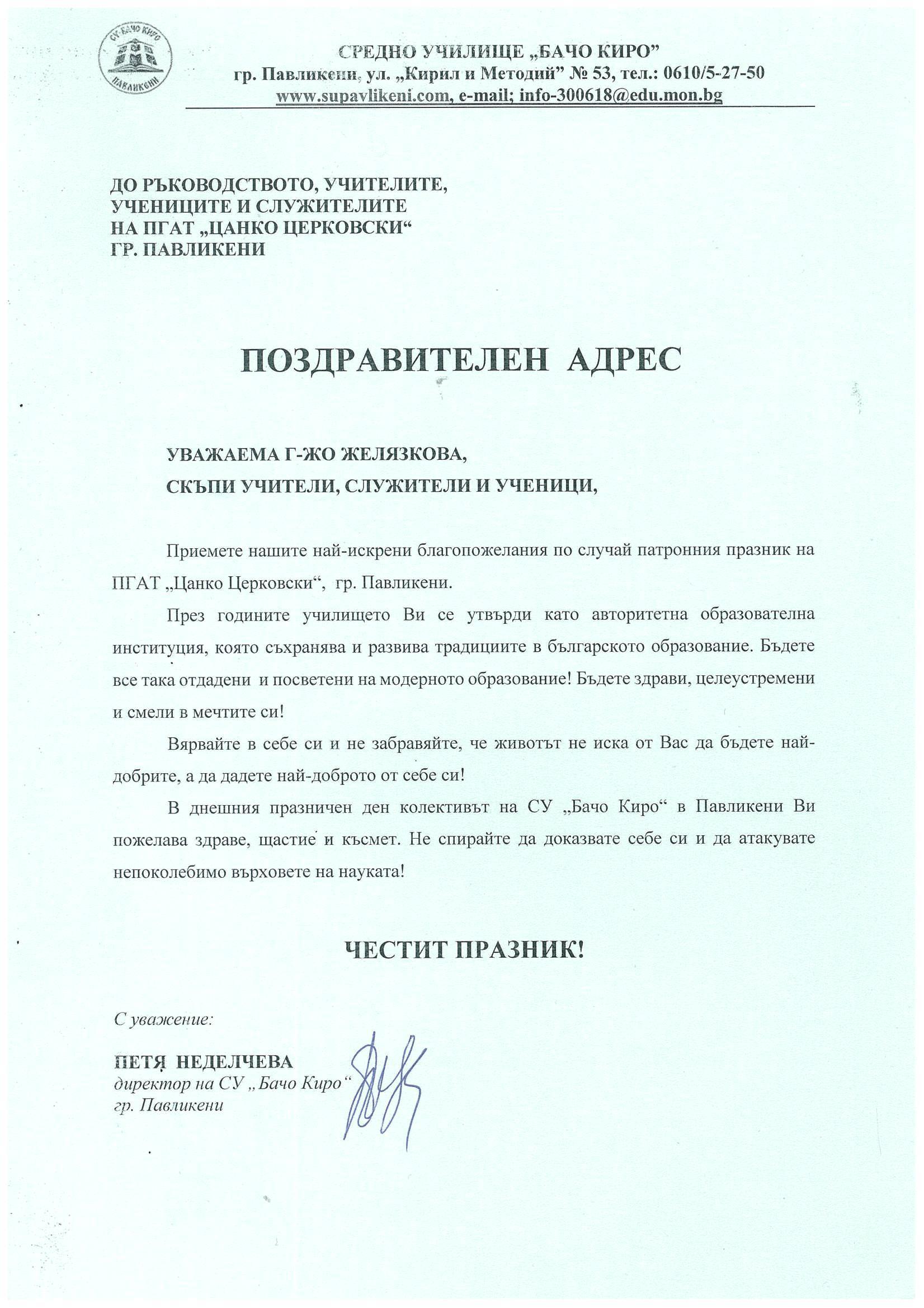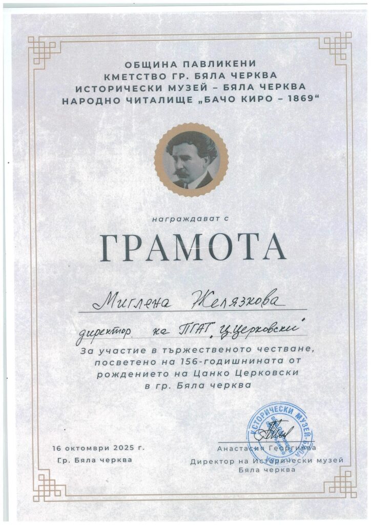 Директорът на ПГАТ „Цанко Церковски“, Миглена Желязкова, припомни завета на Цанко Церковски – „да бъдем будни, достойни и всеотдайни граждани, с вяра в знанието и доброто“. Тя подчерта ролята на училището в изграждането на личности, като каза,че в гимназията учениците учат не само професии, а и ценности като – отговорност, трудолюбие и човечност.