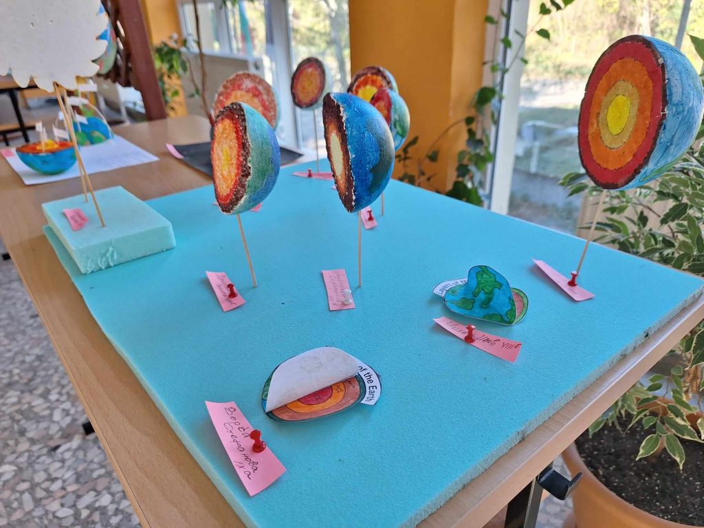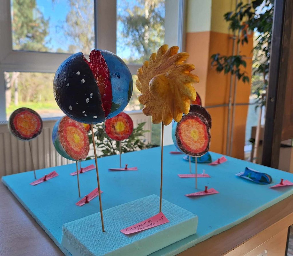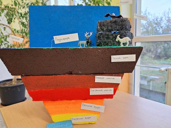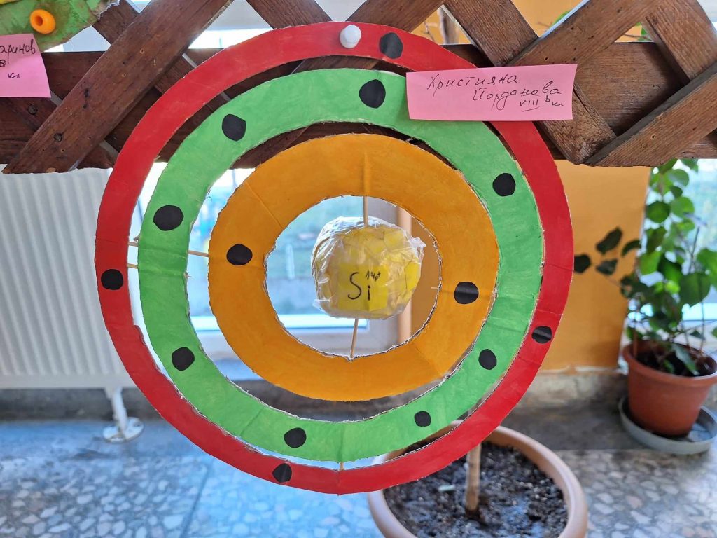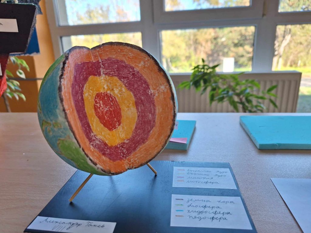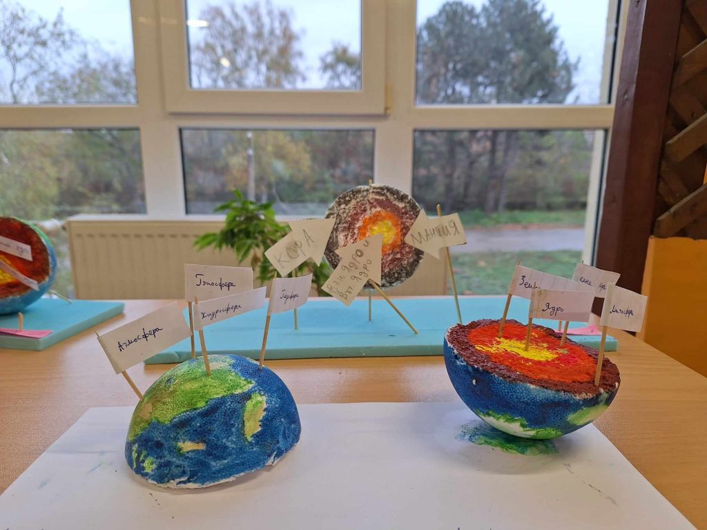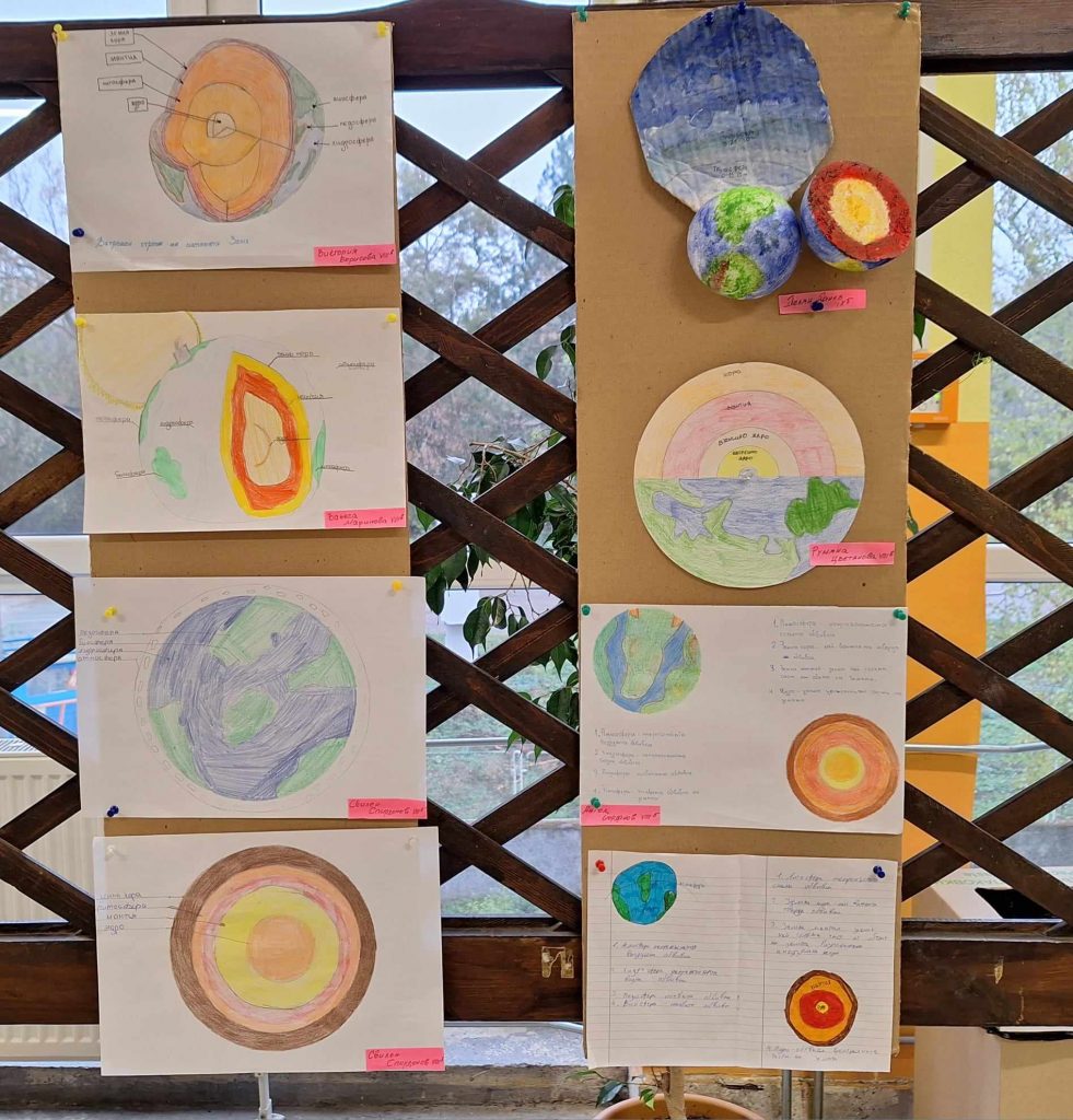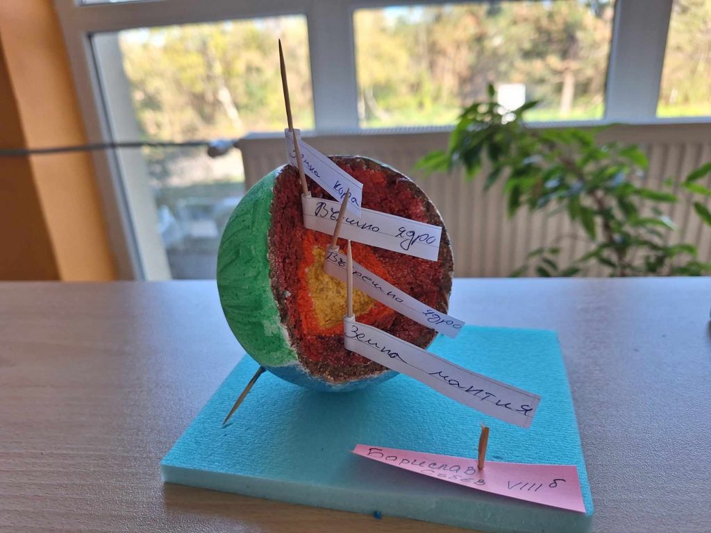 Проекти на учениците от 8 клас по география и икономика и химия и опазване на околната среда. Разработките представят геосферен строеж на системата Земя и модели на строежа на атома на различни химични елементи. Поздравления за труда.